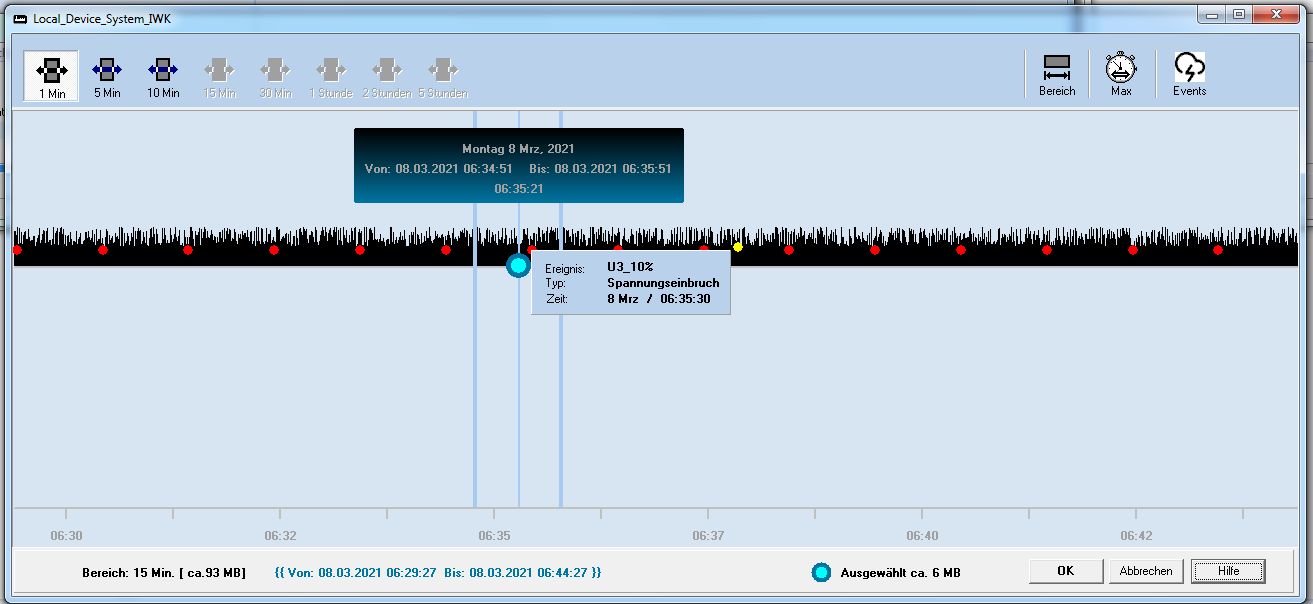 Sobald der Mauszeiger über einem Kügelchen ist, erscheint Info über entsprechendes Ereignis. Drückt man den Mausbutton innerhalb des Info-Fensters, positioniert sich der Zeiger der aktuellen Position sofort auf das Ereignis. Der Rest: Man wählt einen Ausschnitt aus den Daten rund um dieses Ereignis und drückt den Button OK. Nach sofortiger Datenübertragung wird der Anator geöffnet und man führt die Analyse fort. Im Anator können verschiedene Parameter rund um den Zeitpunkt des Ereignisses abgebildet werden.