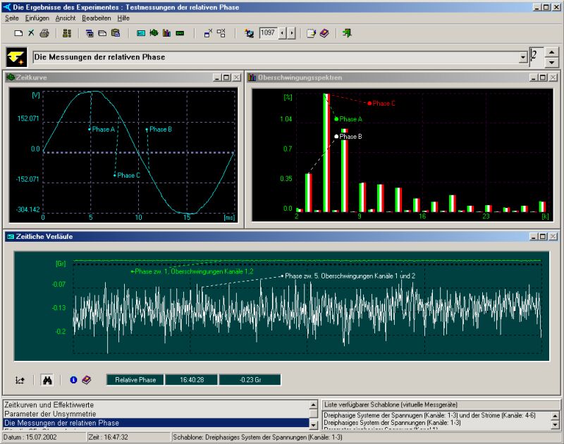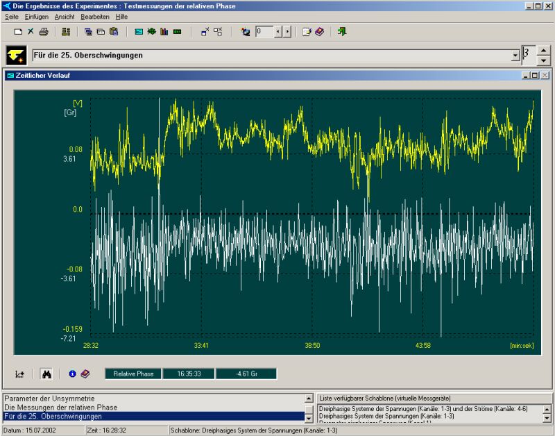 Unten auf dem Graph sind zeitliche Verläufe der relativen Phase zwischen der 1. Oberschwingung des Kanals 1 und der 1. Oberschwingung des Kanals 2 (grüne Linie ) sowie der 5.Oberschwingung des Kanals 1 und der 5. Oberschwingung des Kanals 2 (weisse Linie) dargestellt. Die Amplitude der 5. Oberschwingung schwankt um den Wert 1,3% der Amplitude der 1. Oberschwingung 50 Hz (230 V). Die Phasenverschiebung stellt den Messfehler dar und