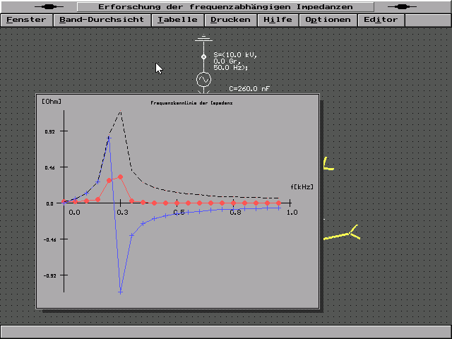 Stromquelle variiert werden, um die entsprechenden Ausschnittsnummern einzustellen. Zur Kontrolle des Stroms und des Leistungsfaktors empfiehlt es sich, den Analysator zu benutzen. Damit das möglich ist, müssen entsprechend Meßpfeile an den gewünschten Stellen der Schaltung plaziert werden. Bitte Beachten Sie auch, dass nach der Durchführung von Berechnungen mit dem Button "Frequenz" eine Liste geöffnet werden kann, in der die