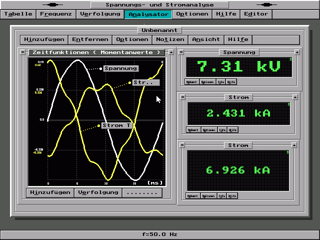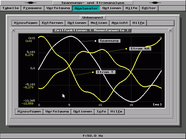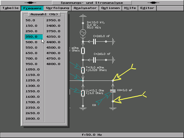 Frequenzen aufgelistet sind, die von der polyharmonischen Quelle bereitgestellt werden und die Frequenz der Spannungsquelle des Versorgungssystems (50Hz). In dem Sie eine Frequenz aus dieser Liste auswählen, können Sie die Resultate der Berechnungen speziell für diese eine Frequenz kontrollieren.