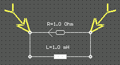 Um die Anschlußstellen anzugeben, die als Bezugspunkte für die Widerstandsberechnung dienen sollen, enthält das Menü der Schaltelemente folgende Pfeile .  Mit diesen Pfeilen können alle Mausaktionen durchgeführt werden, die wir schon bei anderen Schaltelementen kennengelernt haben(z.B. "nehmen", "ziehen" etc.) Nehmen Sie nun zwei solche Pfeile aus dem Menü und plazieren Sie diese so, dass sie mit ihren Spitzen auf je einen Knotenpunkt der Schaltung zeigen, während die anderen Enden frei sind .