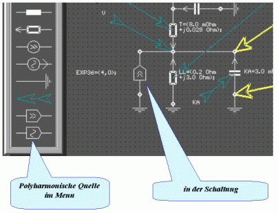 Um die mit einem Messsystem der Serie IWK gemessene Spannungen oder Ströme direkt in die Ersatzschaltung aufzunehmen, enthält das Menü der Schaltungselemente des RLC-Programms spezielle sog. polyharmonische Quelle. Die Einführung einer polyharmonischen Strom- bzw. Spannungsquelle in die simulierte Schaltung
