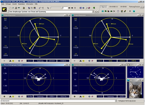 Zwei universelle Zeigerdiagrammen unten bilden alle Frequenzkomponente beider Systeme als Zeigern ab. Durch die Steuerungsmitteln, die jedes Objekt enthält: über einfache Bewegung des Mauszeigers alle Parameter jeder Komponente (Oberschwingung) ablesen und dokumentieren. Beliebige Fotos können in das Abbildungssystem aufgenommen werden und weiter als Bestandteil der Messdaten behandelt werden.